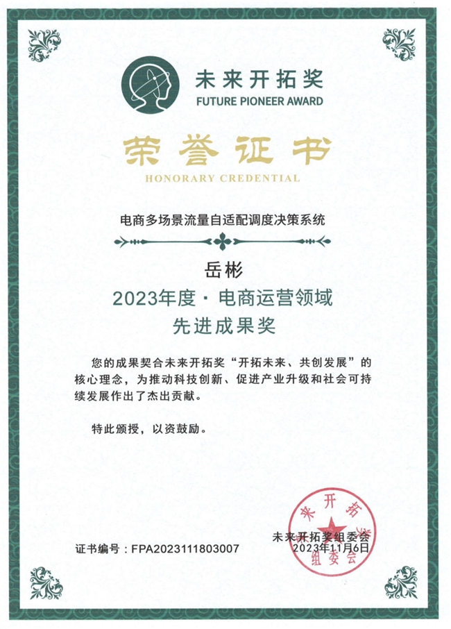 2023年11月6日,杭州热点榜文化传媒有限公司董事长兼首席战略技术官岳彬,作为电商营销的资深专家,凭借其自主研发的“电商多场景流量自适配调度决策系统”,荣获未来开拓奖2023年度电商营销领域先进成果奖,展现了技术驱动商业创新的卓越实力。