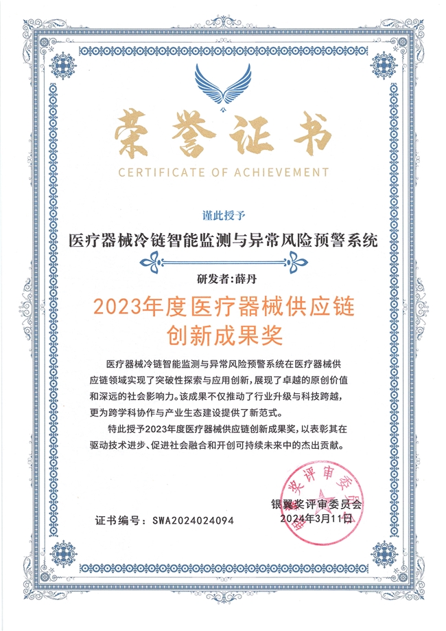 近日,在备受瞩目的2023年度银翼奖颁奖典礼上,苏州迈德泰克国际贸易有限公司总经理薛丹凭借其自主研发的《医疗器械冷链智能监测与异常风险预警系统》,荣获了“2023年度医疗器械供应链创新成果奖”。该奖项的授予,肯定了薛丹在医疗器械供应链技术研发上的持续创新,也彰显了其成果在行业应用和智能化发展中的实际价值。