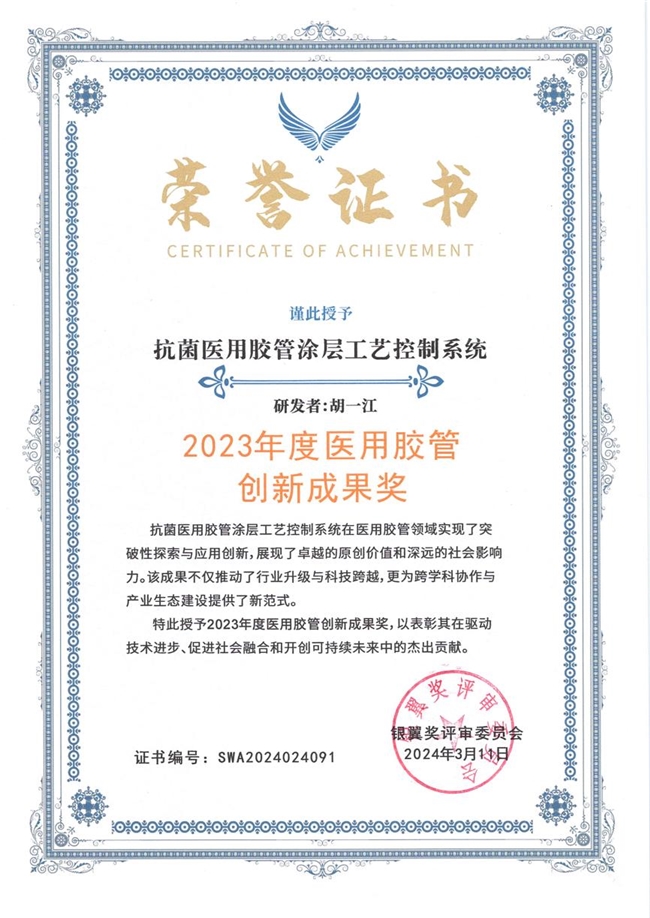 银翼奖(Silver Wings Award)由先锋创新研究所设立,是国内极具影响力的综合性专业奖项。奖项始终秉承“创新、卓越、引领、共融”的宗旨,致力于推动跨学科协作与科技社会的深度融合。胡一江此次获奖,标志着其研发的医用胶管抗菌涂层技术获得了业界权威的肯定,为整个行业在材料安全与智能化生产方面树立了新的标杆。