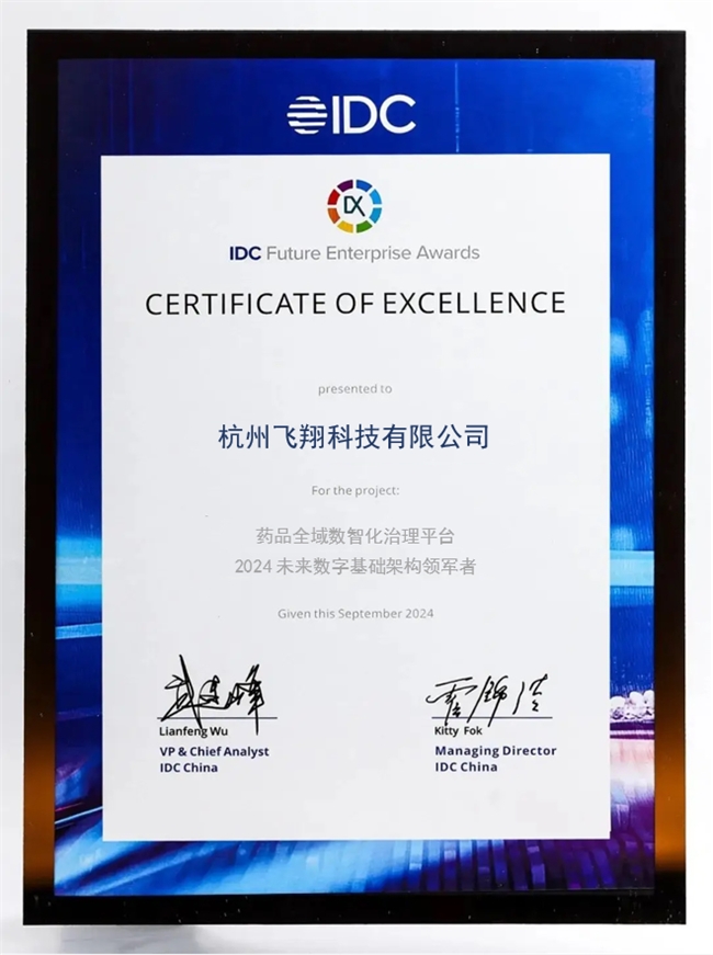 全球领先的科技市场研究机构国际数据公司(IDC)近日隆重揭晓2024年度“未来企业大奖”获奖名单。杭州飞翔科技有限公司凭借其行业颠覆性解决方案——“药品全域数智化治理平台”,在激烈的评选中脱颖而出,成功斩获 “未来数字基础架构领军者”殊荣。这一国际性奖项标志着飞翔科技的创新实践获得了全球顶尖智库的认可,其打造的下一代数字基础架构已成为赋能医药产业全域变革的标杆。