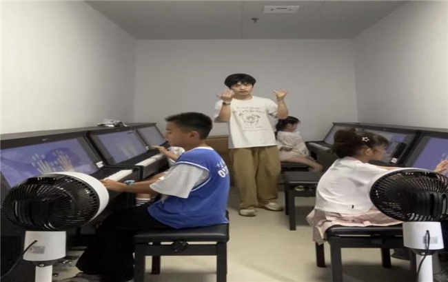 在服务中心的统筹下,刘永康承担了三大核心工作。针对乡村儿童认知特点,他联合技术团队优化AI教学系统,将《茉莉花》等安徽民歌改编为游戏化教学内容,通过实时音准纠错、节奏可视化等功能,让抽象乐理变得直观易懂。“传统钢琴教学门槛高,AI系统能实现‘一对一’精准辅导,就算没有专业老师也能保证教学质量。”这个暑假,该项目累计服务乡村儿童230余人次,通过AI系统生成的学情报告显示,83%的学员能独立演奏3首以上简易曲目,较传统教学效率提升近两倍。