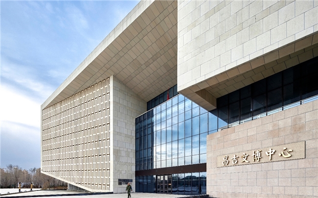 项目位于昌吉新区文体公园核心区,建筑西侧以完整界面呼应城市主干道的现代化气息,东侧则面向中心绿地采用发散式布局,形成多重视野通廊。外立面采用精巧的石材砌筑构造,是对昌吉传统砖雕文化的现代演绎,细部设计融入地方文化图腾,实现传统与现代的完美结合。