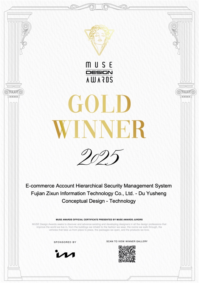 近日,2025 年缪斯设计奖(Muse Design Awards)获奖名单正式揭晓。来自福建紫讯信息科技有限公司的技术总监杜玉生先生,凭借其研发的 “电商账号分级安全管理系统”,在全球众多申报作品中脱颖而出,斩获 “2025缪斯奖概念设计技术类-金奖”。缪斯设计奖竞争异常激烈,今年从全球一万多件申报作品中仅评选出约 1200 件获奖作品,杜玉生先生的获奖,不仅是对他个人研发能力的高度认可,也标志着该系统在全球设计领域的突出地位。