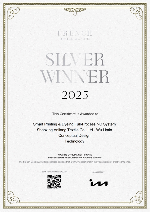 纺织行业再添中国亮色!安徽安粮实业发展有限公司副总经理、绍兴安粮纺织品有限公司总经理吴丽敏主导研发的 “印染搭配全流程智能化数控系统”,凭借对传统纺织印染行业生产模式的颠覆性创新、全链路数字化的功能设计,以及为企业降本增效、推动行业绿色转型的突出价值,成功斩获 2025 年度法国设计奖(French Design Awards)概念设计技术银奖。