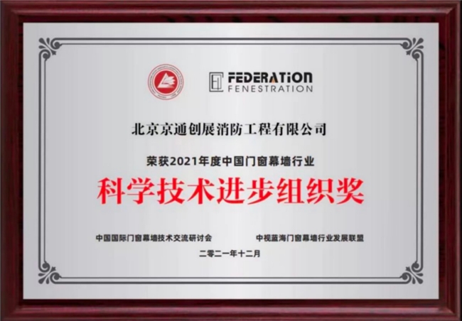 研讨会颁奖典礼于28日晚举行,现场颁发了“中国门窗幕墙行业科学技术进步推动奖”“中国门窗幕墙行业科学技术进步组织奖”“中国门窗家装品牌百强”“中国门窗幕墙配套件品牌百强”四大奖项,以表彰和鼓励企业在门窗幕墙领域所取得的成绩与贡献。北京京通创展消防工程有限公司凭借其在防火门窗领域的技术创新和卓越贡献,荣获了“2021年度中国门窗幕墙行业科学技术进步组织奖”,这一荣誉不仅是对其过去一年技术成果的认可,更是对公司未来发展的激励。总经理高伟在代表公司领奖时表示:“获得这一奖项,我们感到非常荣幸。这既是对我们过去工作的肯定,也是对我们未来发展的鞭策。北京京通创展将继续加大研发投入,推动技术创新,为防火门窗行业的发展贡献更多力量。”