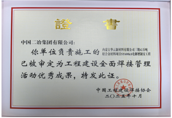11月17日至19日,由中国工程建设焊接协会主办的2025年度工程建设全面焊接管理活动成果发布暨经验交流会议在北京召开,由中国二冶钢构分公司施工的内蒙古华云新材料有限公司三期42万吨轻合金材料项目SY600kA电解槽制安工程,获2025年度全国工程建设全面焊接管理活动优秀成果奖。